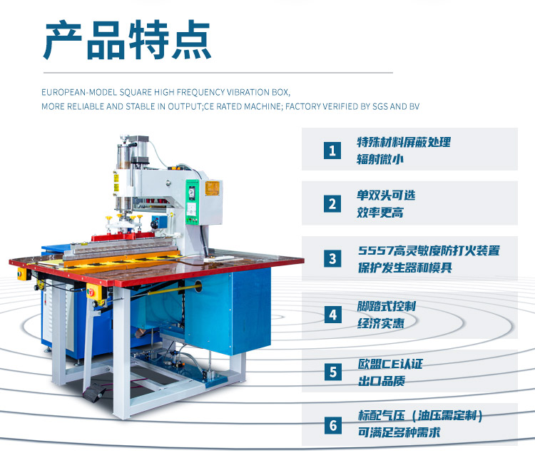 1.高頻熔斷及裁斷可一次完成,節(jié)省生產(chǎn)工序。對(duì)于普通高頻機(jī)只能熔接,無法裁斷的產(chǎn)品,此系列設(shè)備均完成。2.本系列機(jī)型配備高靈敏度火花保護(hù)器,遇到打火狀況,能及時(shí)切斷高頻輸出,保護(hù)模具產(chǎn)品及設(shè)備。