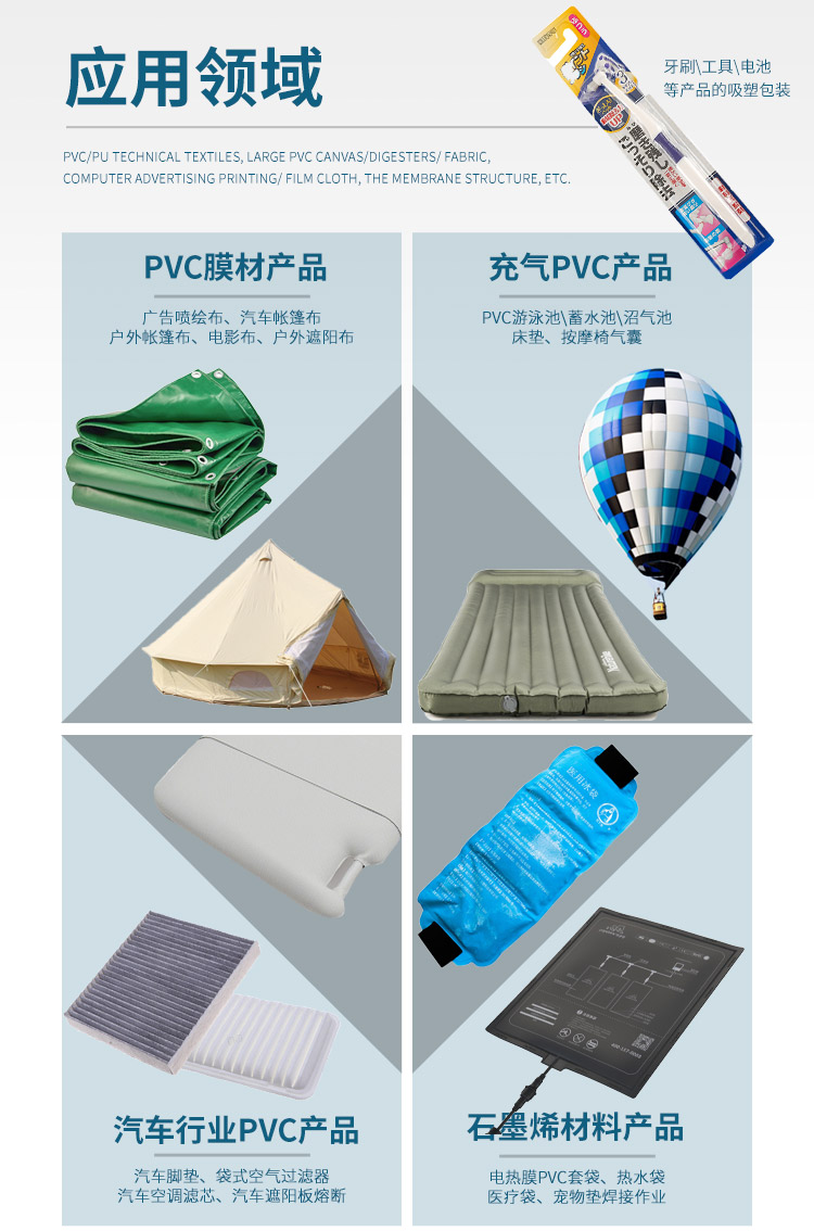 也可用于環(huán)保材質(zhì)的雙面吸塑泡殼的封口包裝、吸塑紙卡包裝、牙刷封口包裝,以及EVA布類皮革、真皮
