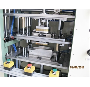 ※熱板機(jī)上壓板機(jī)構(gòu):由氣缸、直線軸承、4立柱φ30導(dǎo)桿、熱板機(jī)模具、氣動(dòng)夾緊裝置、真空吸盤等部件組成。氣缸作為動(dòng)力源,帶動(dòng)熱板機(jī)構(gòu)沿四條導(dǎo)桿上下作直線運(yùn)動(dòng)。真空系統(tǒng)采用進(jìn)口真空發(fā)生器輸出真空壓力,通過(guò)真空吸盤來(lái)將膠件牢固的吸住,確保膠件正確定位,不損壞膠件表面。