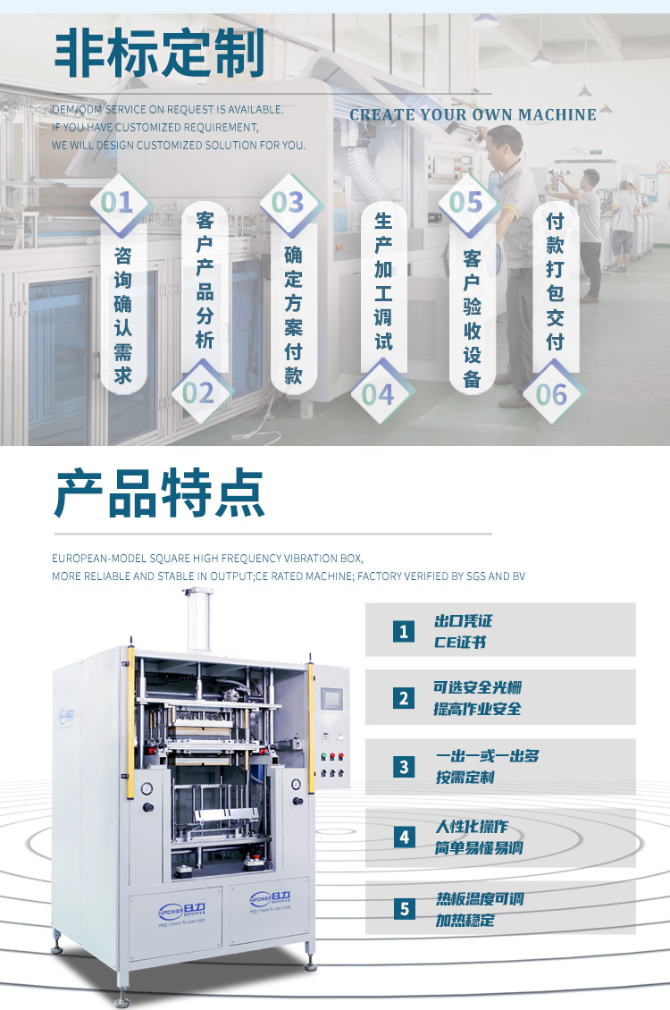 ※熱板機(jī)整機(jī)結(jié)構(gòu)特點(diǎn):采用國(guó)標(biāo)優(yōu)質(zhì)矩形鐵管焊接而成,表面再經(jīng)噴塑工藝處理。門板由數(shù)控折彎?rùn)C(jī)及沖床加工成型后,表面再經(jīng)噴塑工藝處理。熱板移動(dòng)機(jī)構(gòu)由氣缸、滑塊導(dǎo)軌、熱板等部件組成。氣缸作為動(dòng)力源,帶動(dòng)熱板機(jī)構(gòu)沿兩條滑塊導(dǎo)軌前后作直線運(yùn)動(dòng)。熱板焊接機(jī)部件:由熱板模、加熱板組成,熱板模與加熱板通過(guò)快速定位緊固機(jī)構(gòu),與熱板移動(dòng)機(jī)構(gòu)連接。熱板機(jī)結(jié)構(gòu)的特點(diǎn)是:熱板在運(yùn)動(dòng)時(shí),平穩(wěn)且運(yùn)動(dòng)間隙小。熱板機(jī)構(gòu)上,帶加熱板及上、下熱模,以及加熱板固定熱模的快速聯(lián)接機(jī)構(gòu),能夠有效快速更換不同產(chǎn)品,優(yōu)化了其使用范圍、提高了生產(chǎn)效率。熱板機(jī)上、下模板通過(guò)4根限位導(dǎo)桿與熱板焊接機(jī)聯(lián)接在一起,可以精確調(diào)整焊接深度,共同組成一個(gè)設(shè)備的主要運(yùn)動(dòng)部件。