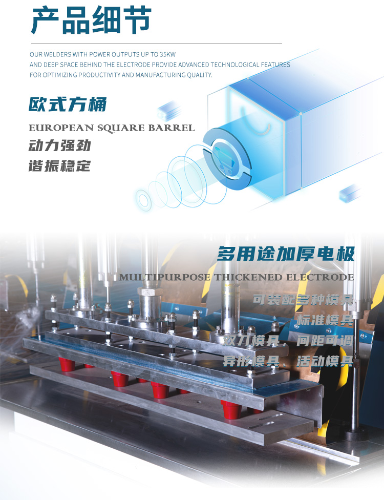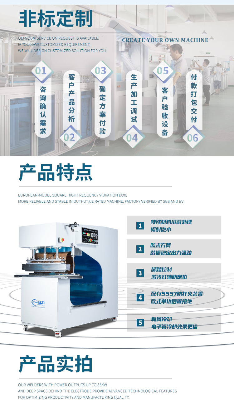 | 機(jī)器特點(diǎn): | 機(jī)器料槽深寬,方便大面積連續(xù)接駁。歐洲制式方形高頻振蕩箱,出力更大,更加穩(wěn)定。采用高靈敏度火花控制器,有效防止損壞模具。 |