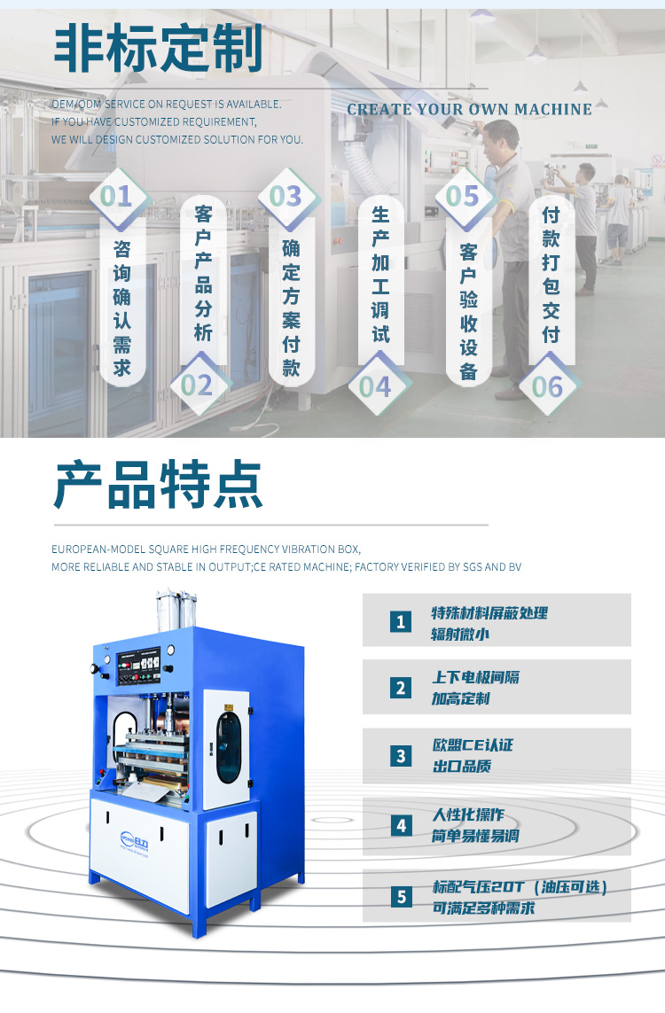 | 機(jī)器特點(diǎn): | 定位精準(zhǔn)、熔斷機(jī)配有NL-5557高周波火花保護(hù)系統(tǒng),靈敏度極高,防止燒損高周波模具 |