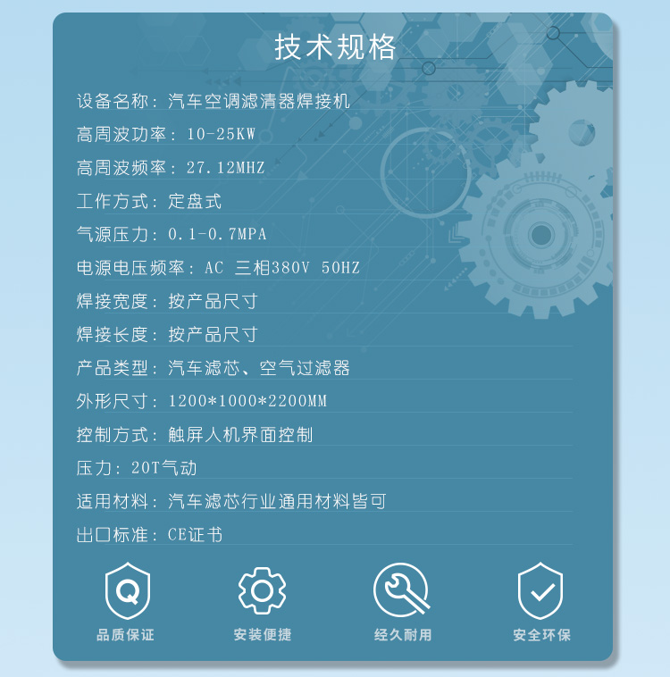 主要用于 汽車過濾器熔接機,空氣過濾袋熔接機,汽車濾芯熔接機,汽車風格熔接機,空調(diào)濾清器熔接機,空氣濾清器熔接機。主要用于空調(diào)濾清器,俗稱花粉濾清器的熔接成型。也可用于需要高周波熔接同時又必須同步裁斷的產(chǎn)品加工,高周波機的工作原理是利用高周波先熔接再通過機器配有的壓力裝置同時切斷。因為是同時完成,所以稱為高周波同步熔斷機。也稱為高周波熔斷機、熔斷機、高周波同步裁斷機、高周波裁斷機。