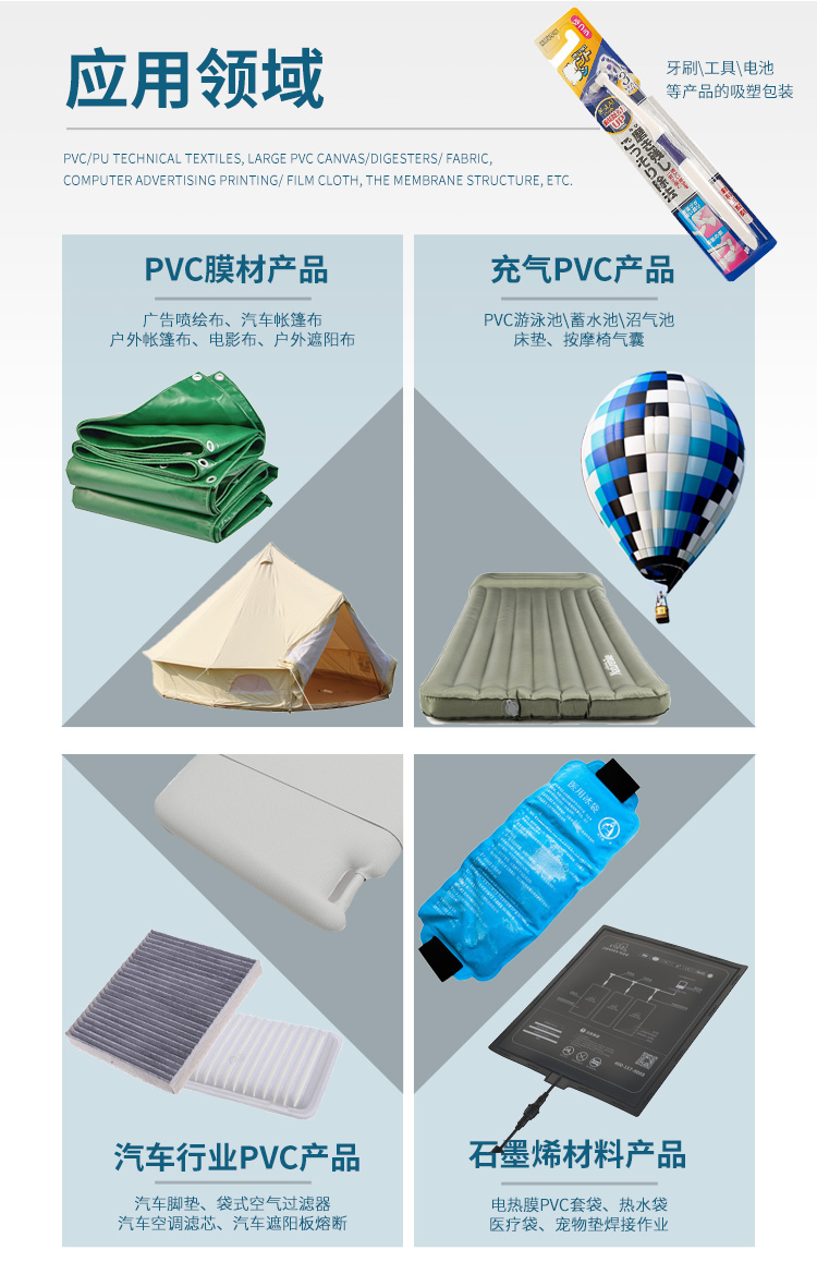 焊接熱合其他行業(yè)類的高周波熔接:救生衣、漂流艇、漂流船、浮排、窗簾、浴簾、充氣水池、游泳池、保健床墊、玉石床墊、充氣床墊、吹氣沙發(fā)、線束、水囊等。