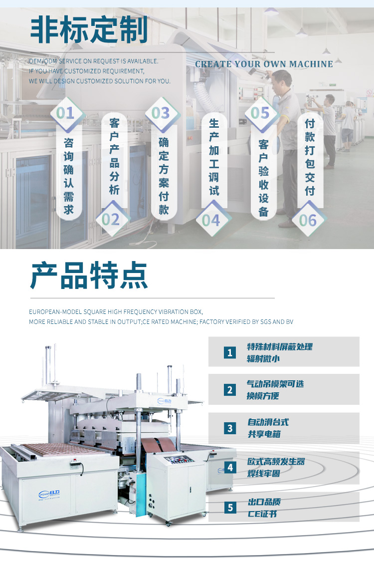 機器特點: 1、歐式電箱,高頻出力強勁穩(wěn)定,25KW 2、雙滑臺式, 效率高3、超長高周輸出時間,不燒電氣件,經(jīng)久耐用 4、源自歐洲,自動高周技術(shù), 可選 5、特殊屏蔽處理,人體輻射微少,6、電子管配獨立的新風(fēng)冷卻系統(tǒng),