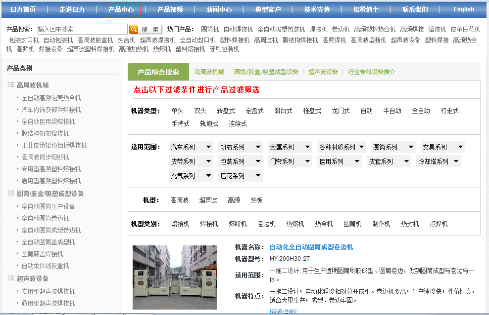 目前公司生產(chǎn)機(jī)型產(chǎn)品幾百款,為方便新老用戶更快更精準(zhǔn)的檢索到符合自己所需的超聲波、高周波機(jī)器產(chǎn)品,網(wǎng)站推出功能強(qiáng)大的機(jī)械產(chǎn)品過(guò)濾功能,用戶可點(diǎn)擊菜單欄中的產(chǎn)品中心,通過(guò)機(jī)器類型、適用范圍、機(jī)型、機(jī)型類別過(guò)濾出相關(guān)機(jī)型
