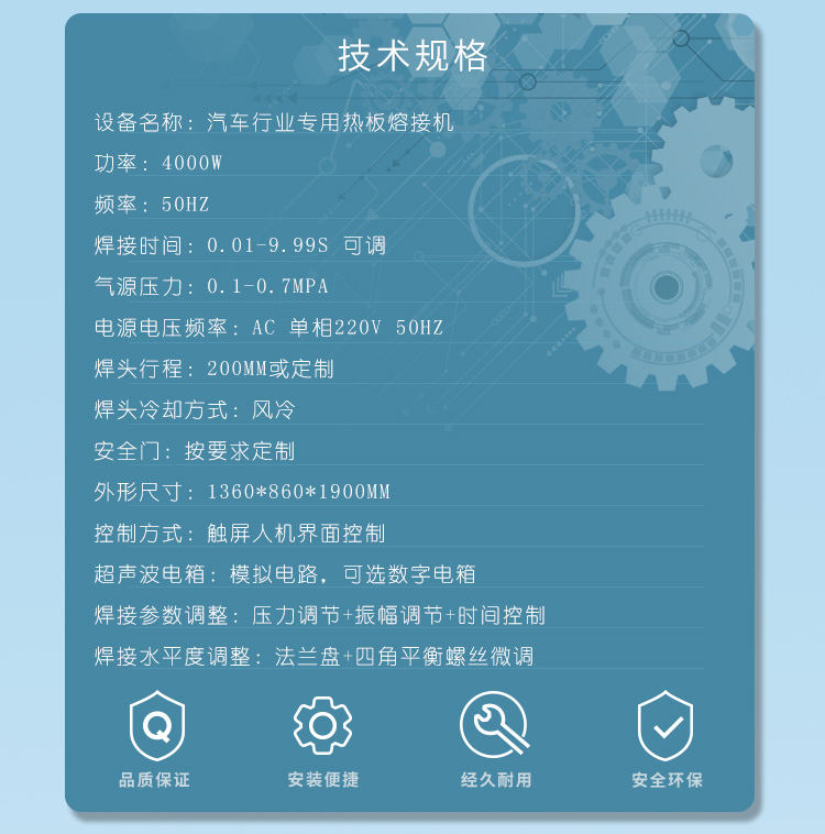| 適用范圍: | 主要主要適合焊接產(chǎn)品面積大、不規(guī)范的塑料產(chǎn)品,如:汽車手套箱焊接,汽車保險(xiǎn)杠焊接,汽車儀表臺(tái)焊接,汽車水箱焊接,汽車尾燈熱板焊接,蓄電池?zé)岚搴附拥取? |