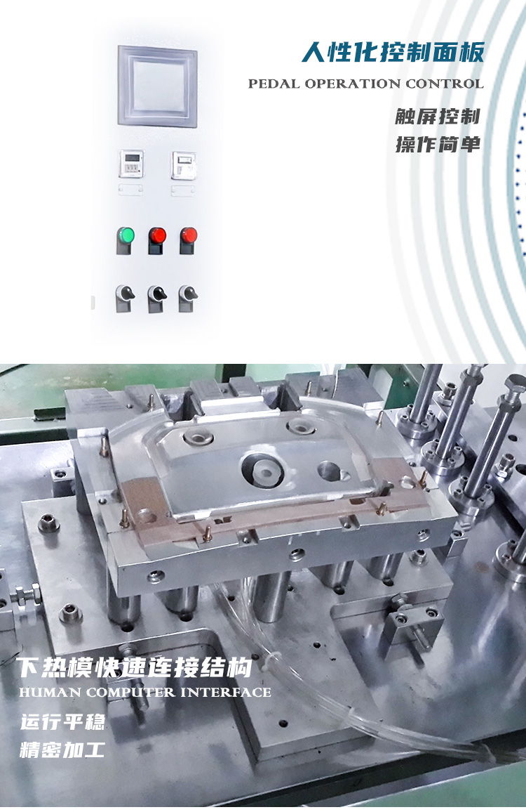 ※熱板機(jī)整機(jī)結(jié)構(gòu)特點(diǎn):采用國(guó)標(biāo)優(yōu)質(zhì)矩形鐵管焊接而成,表面再經(jīng)噴塑工藝處理。門板由數(shù)控折彎?rùn)C(jī)及沖床加工成型后,表面再經(jīng)噴塑工藝處理。熱板移動(dòng)機(jī)構(gòu)由氣缸、滑塊導(dǎo)軌、熱板等部件組成。氣缸作為動(dòng)力源,帶動(dòng)熱板機(jī)構(gòu)沿兩條滑塊導(dǎo)軌前后作直線運(yùn)動(dòng)。熱板焊接機(jī)部件:由熱板模、加熱板組成,熱板模與加熱板通過(guò)快速定位緊固機(jī)構(gòu),與熱板移動(dòng)機(jī)構(gòu)連接。熱板機(jī)結(jié)構(gòu)的特點(diǎn)是:熱板在運(yùn)動(dòng)時(shí),平穩(wěn)且運(yùn)動(dòng)間隙小。熱板機(jī)構(gòu)上,帶加熱板及上、下熱模,以及加熱板固定熱模的快速聯(lián)接機(jī)構(gòu),能夠有效快速更換不同產(chǎn)品,優(yōu)化了其使用范圍、提高了生產(chǎn)效率。熱板機(jī)上、下模板通過(guò)4根限位導(dǎo)桿與熱板焊接機(jī)聯(lián)接在一起,可以精確調(diào)整焊接深度,共同組成一個(gè)設(shè)備的主要運(yùn)動(dòng)部件。