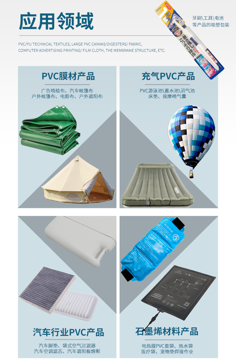 】 通過高周波的原理,用來(lái)做PVC兒童游泳池熔接,高周波PVC沼氣池熔接、PVC蓄水池熔接,也可以用來(lái)做高周波汽車篷布帆布接駁、高周波帳篷布熔接、高周波電影幕布熔接、高周波膜結(jié)構(gòu)拼接、戶外膜結(jié)構(gòu)焊接、膜結(jié)構(gòu)熔接、高頻戶外遮陽(yáng)布熔接、高頻廣告噴繪布焊接、高頻PVC布熔接或含有PVC成分的任何材質(zhì)的軟性塑膠塑料的高周波熔接或拼接。通過高周波的作用后,被高頻熔接的材料,表面光滑平整且美觀牢固。