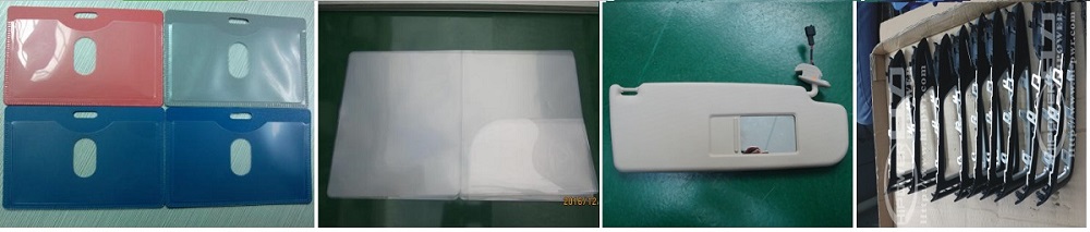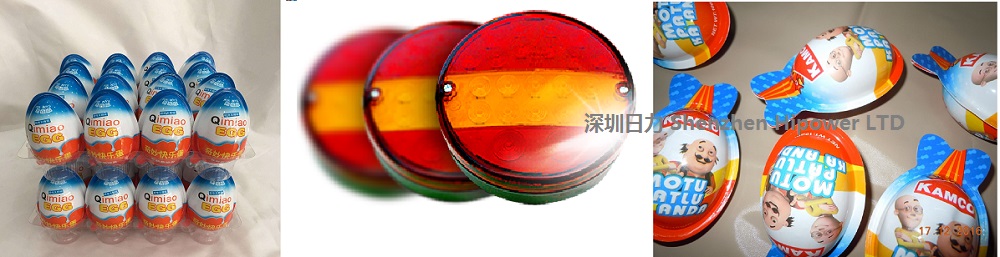 塑膠玩具、玩具槍、塑膠電話、游樂器、飛機、卡通具、PP文卷夾、塑料筆桶、計算機、手機電池、充汽車電器、SD卡、電子表、樂器、錄影帶盒、CD 外殼、手機外殼、汽車后車燈、汽車后視鏡、汽車前角燈、汽車指示燈座、汽車儀表板、汽車喇叭、汽車:保溫杯、內(nèi)松盒、座密封式容器、電源開關盒、繼電器、設定器、電池外殼、整流器、天線結盒、飾品沖花、鎖匙扣、相框、壓克力鉆、打火機、眼鏡盒、手提電筒、時鐘、PP盒、櫥具用品、通訊設備等。