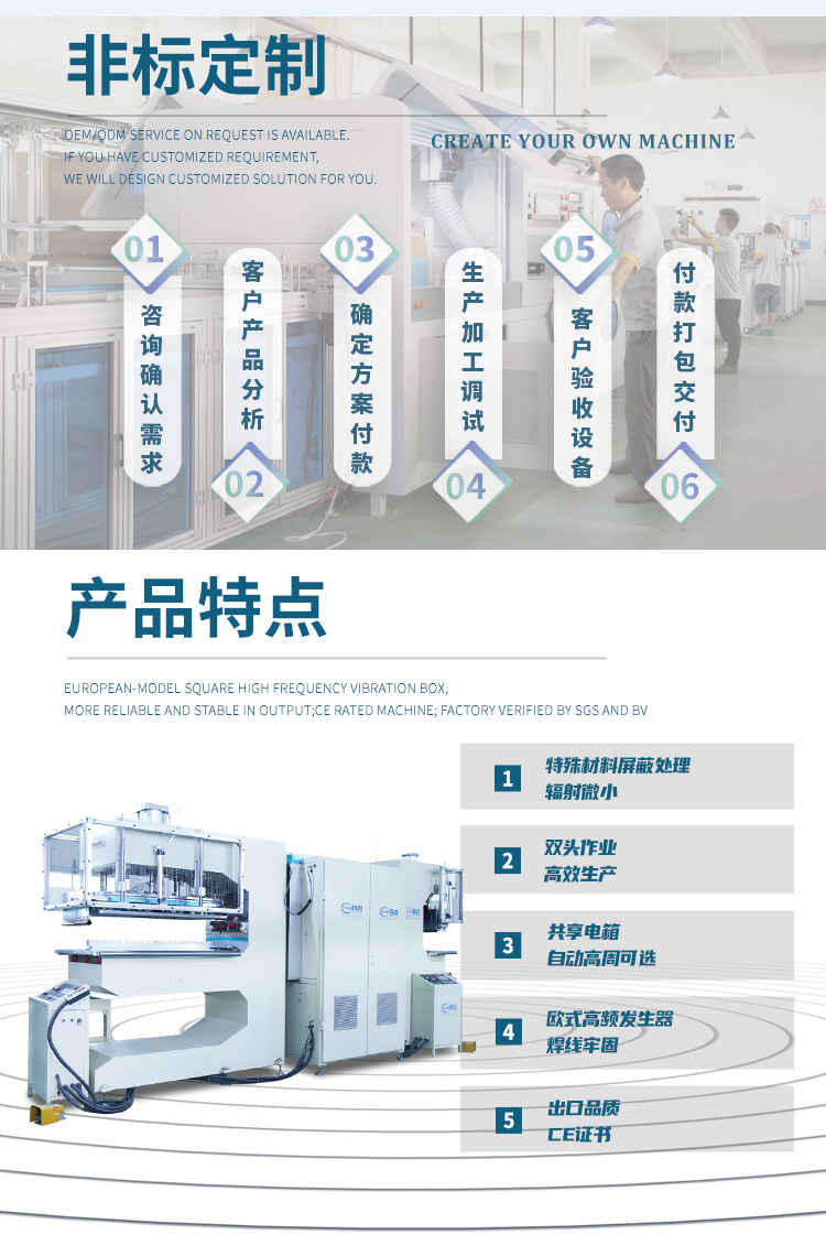 機(jī)器特點(diǎn): | 特征1. 焊接效果美觀:使用高頻焊接原理2. 功能多樣化:主要用于輸送帶、跑步帶和麻將機(jī)帶的接頭。也可用于PVC/PU輸送帶、工業(yè)皮帶等的擋板、裙邊、導(dǎo)條等的焊接3. 加壓方式可選:液壓或氣動都可以4. 生產(chǎn)效率高:雙機(jī)頭設(shè)計,節(jié)省場地,提高效率。 |
